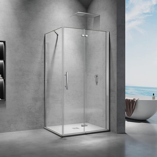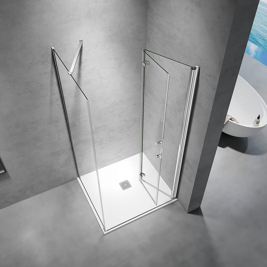 Cabine de douche en verre trempé 6mm anticalcaire avec une porte pivotante pliante et une paroi fixe hauteur 195cm
