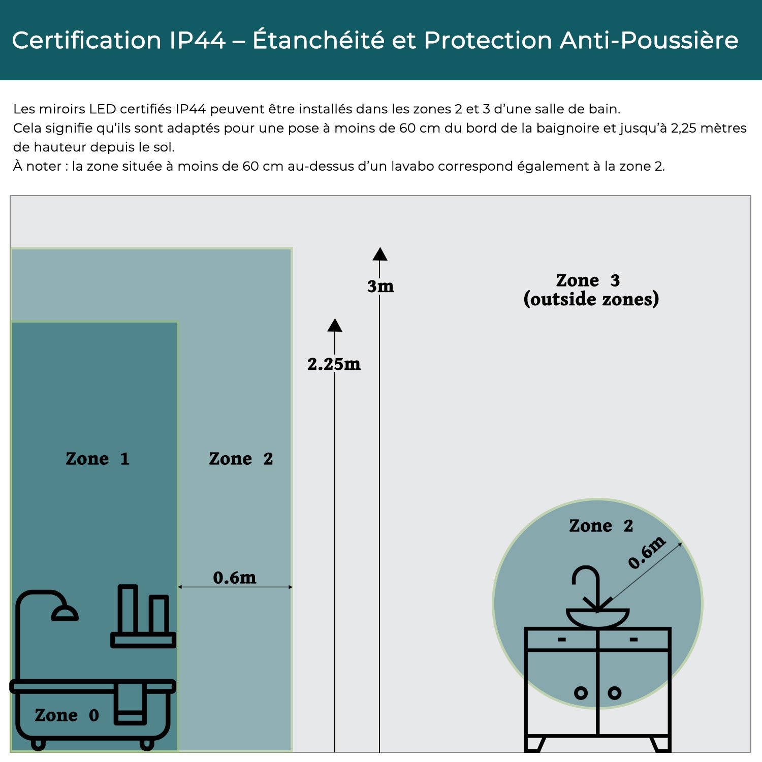 - La fonction antibuée intégrée au centre du miroir est activable via un bouton tactile étanche, garantissant une surface toujours nette, même après une douche chaude.