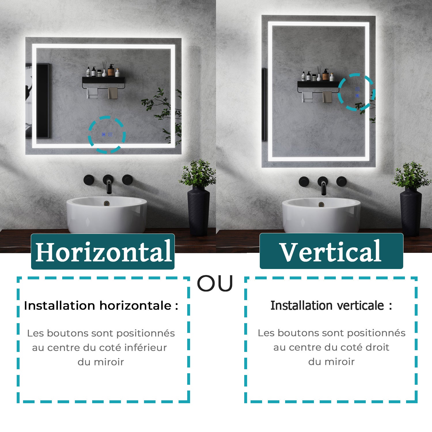 Miroir salle de bain avec éclairage LED et zone antibuée - pose verticale ou horizontale